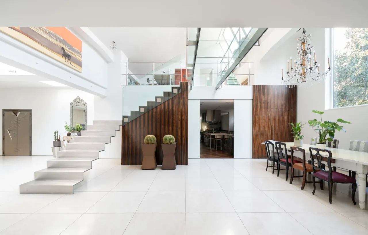 A sculptural staircase leads to the mezzanine, which houses an open study, a guest bedroom and the master suite, conceived as an intimate refuge with an en suite bathroom illuminated by an evocative light well.