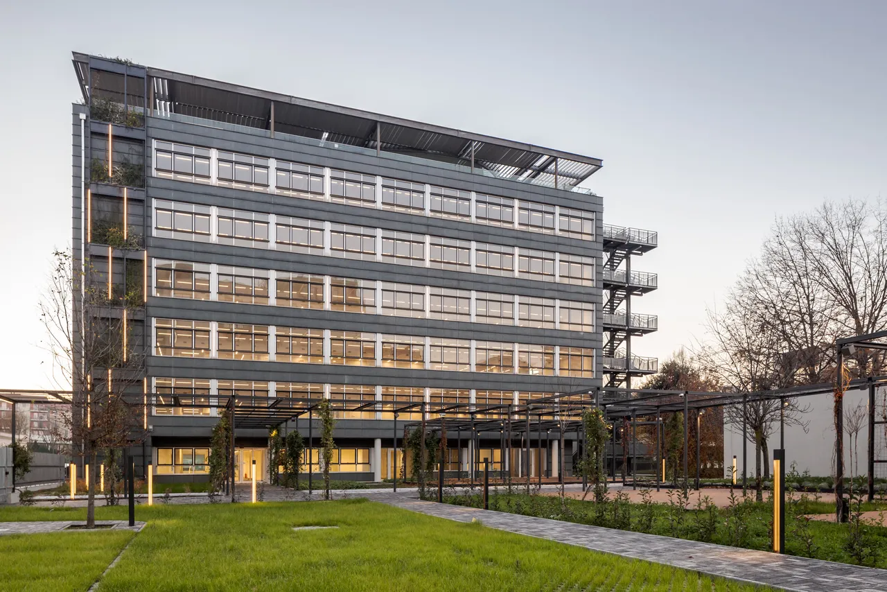 L’edificio è oggetto di una riqualificazione che prevede l’introduzione di un’area verde esterna, di una terrazza giardino in copertura e la valorizzazione delle facciate attraverso l’inserimento di elementi vegetali ed architettonici e di illuminazione decorativa. Saranno inoltre riviste tutte le dotazioni impiantistiche e il concept di utilizzo degli spazi del piano terra dove saranno creati ambienti multifunzione e spazi informali.